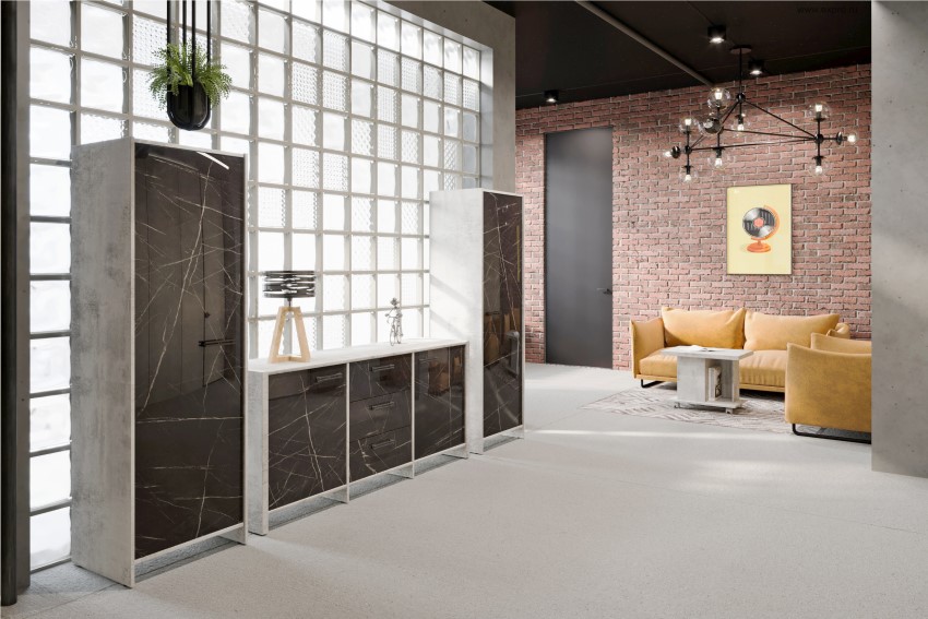 — это три основных декора ЛДСП (Орех Пацифик Табак, Древесина Графит, Хромикс белый) и два дополнительных из лакированной МДФ (Камень Пьетра Гриджиа черный и Мрамор Леванто белый)