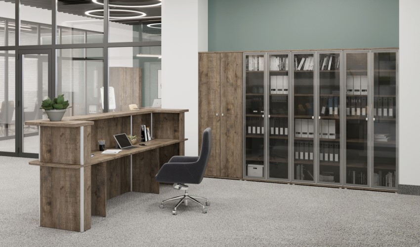 Кабинет Васанта выглядит массивно благодаря широкой плите ЛДСП, из которой он изготовлен. Большой выбор стекол для шкафов поможет выделить, именно место начальника и придаст ему богатый внешний вид. Таким образом, можно разделять зону руководства компании и остального персонала.