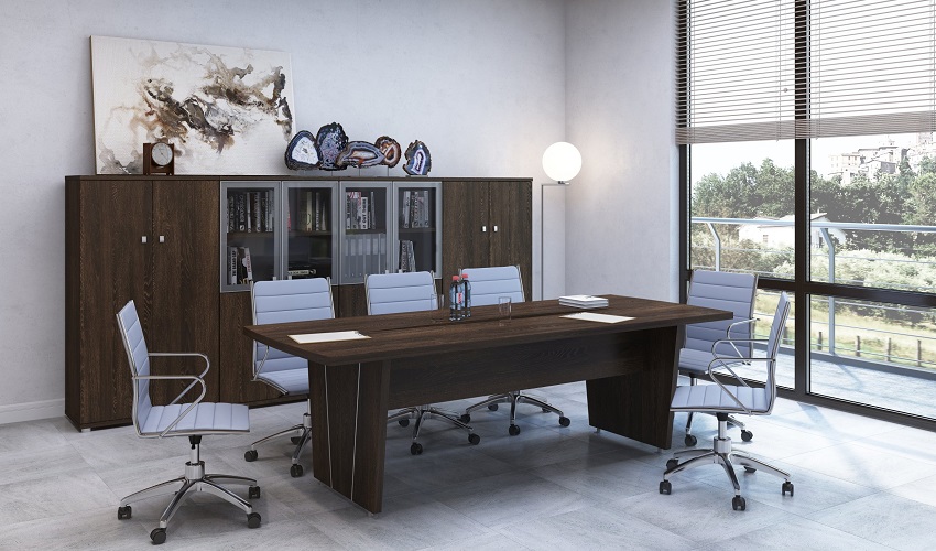 Кабинет Васанта выглядит массивно благодаря широкой плите ЛДСП, из которой он изготовлен. Большой выбор стекол для шкафов поможет выделить, именно место начальника и придаст ему богатый внешний вид. Таким образом, можно разделять зону руководства компании и остального персонала.