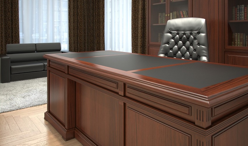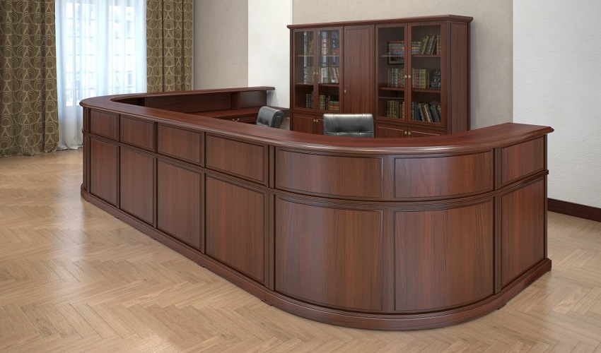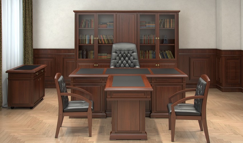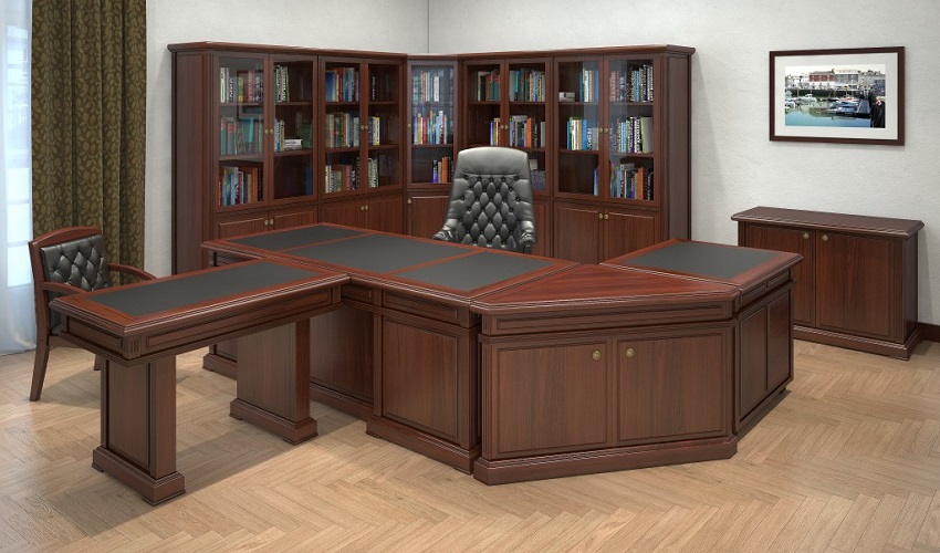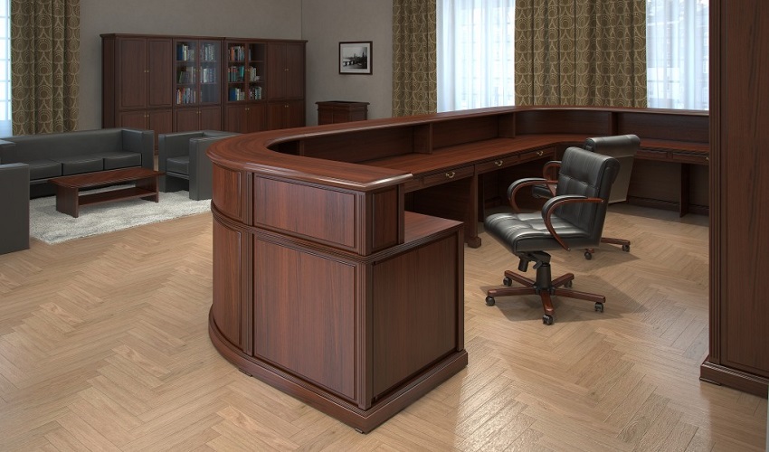 Столы рабочие – шпонированные МДФ, ДСП, рециклированная кожа, толщина столешниц - 46 мм, выдвижные ящики в столешницах рабочих столов, центральный замок в опорных тумбах.
