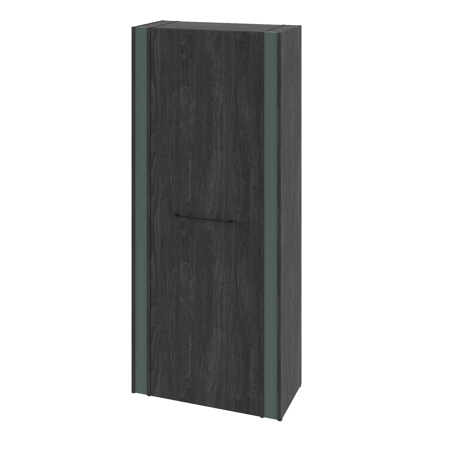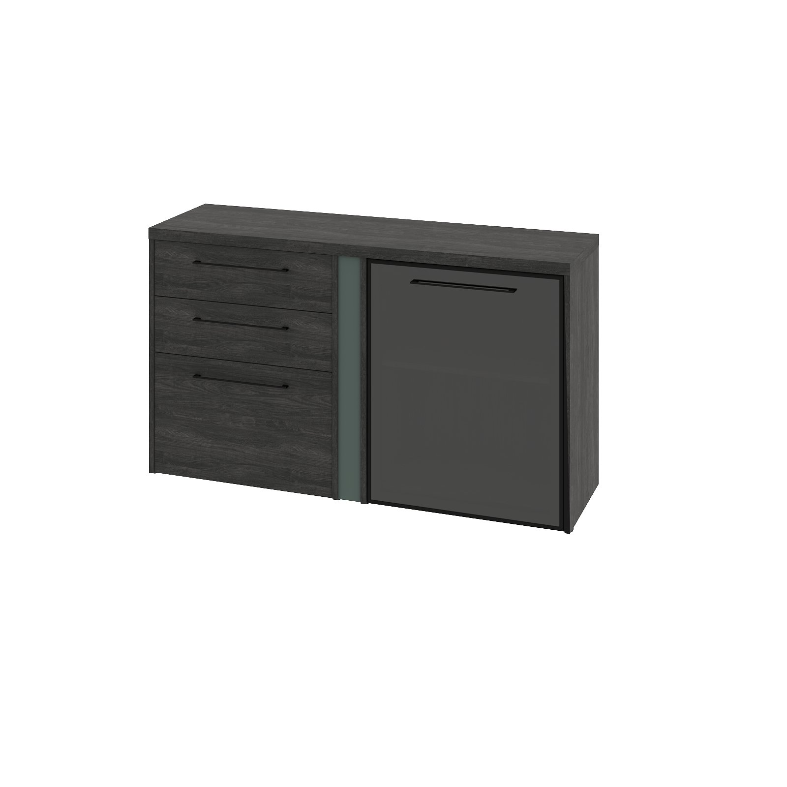 Столешницы, фронтальные панели, верха, низы и бока опор выполнены из ЛДСП Дуб Шерман антрацит 38 мм, облицованы противоударной кромкой ABS 2 мм. Соединители стола выполнены из ЛДСП Дуб Шерман антрацит 18 мм, видимые торцы облицован противоударной кромкой ABS 0,8 мм. Соединители опор выполнены из ЛМДФ Зеленый камень 18 мм с поверхностью PerfectSense Matt с лицевой стороны. Опоры установлены на цоколя из ЛДСП 38 мм, облицованные противоударной кромкой ABS 2 мм в цвете Зеленый камень. Между столешницами и опорами - проставки из ЛДСП 8 мм, заглубленные на 4 мм от краев столешницы и опор, и, облицованные противоударной кромкой ABS 1 мм PerfectSense Matt.