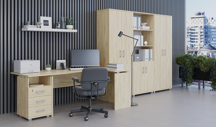 Столы, шкафы, приставные тумбы комплектуются регулируемыми опорами по высоте +/- 10 мм.